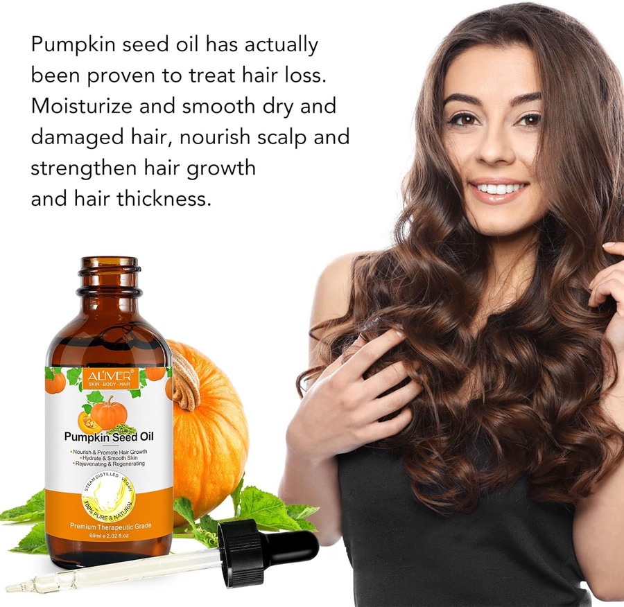 زيت بذور اليقطين يعزز لمعان الشعر حيث يمكن إضافة بضع قطرات إلى الشامبو أو استخدامه كزيت ناقل للعناية بالشعر